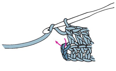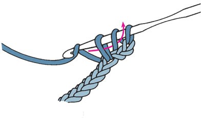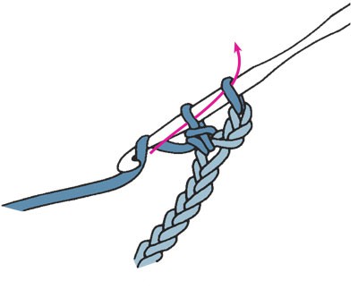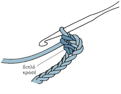 Ξανα φέρνουμε την κλωστη πάνω από το βελονάκι. τραβάμε την τυλιγμένη κλωστή μέσα από τις δύο πρώτες θηλιές.