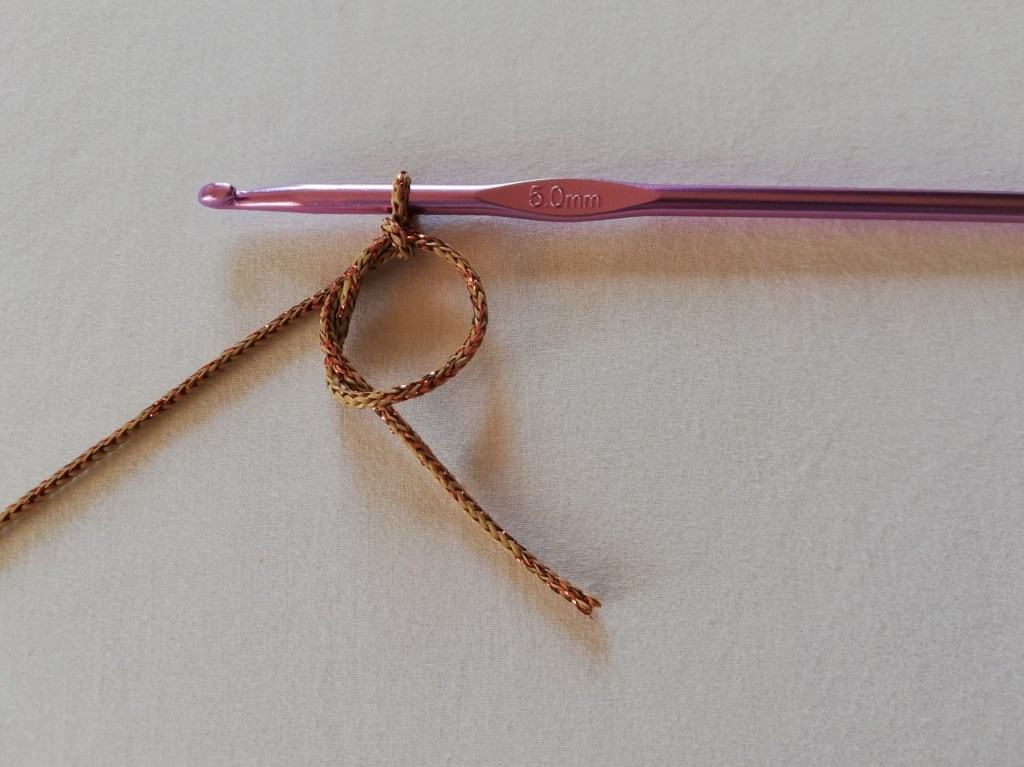 Θα εργαστούμε σε κύκλο και θα κλείνουμε πάντα στο τέλος του κύκλου με βουβό γαϊτανάκι. Ξεκινάμε με το μαγικό μας κύκλο. Βάζουμε το βελονάκι μέσα στον κύκλο παίρνουμε νήμα και κάνουμε μια θηλιά για να σταθεροποιήσουμε. Στον 1ο γύρο θα δουλέψουμε με puff stitches.